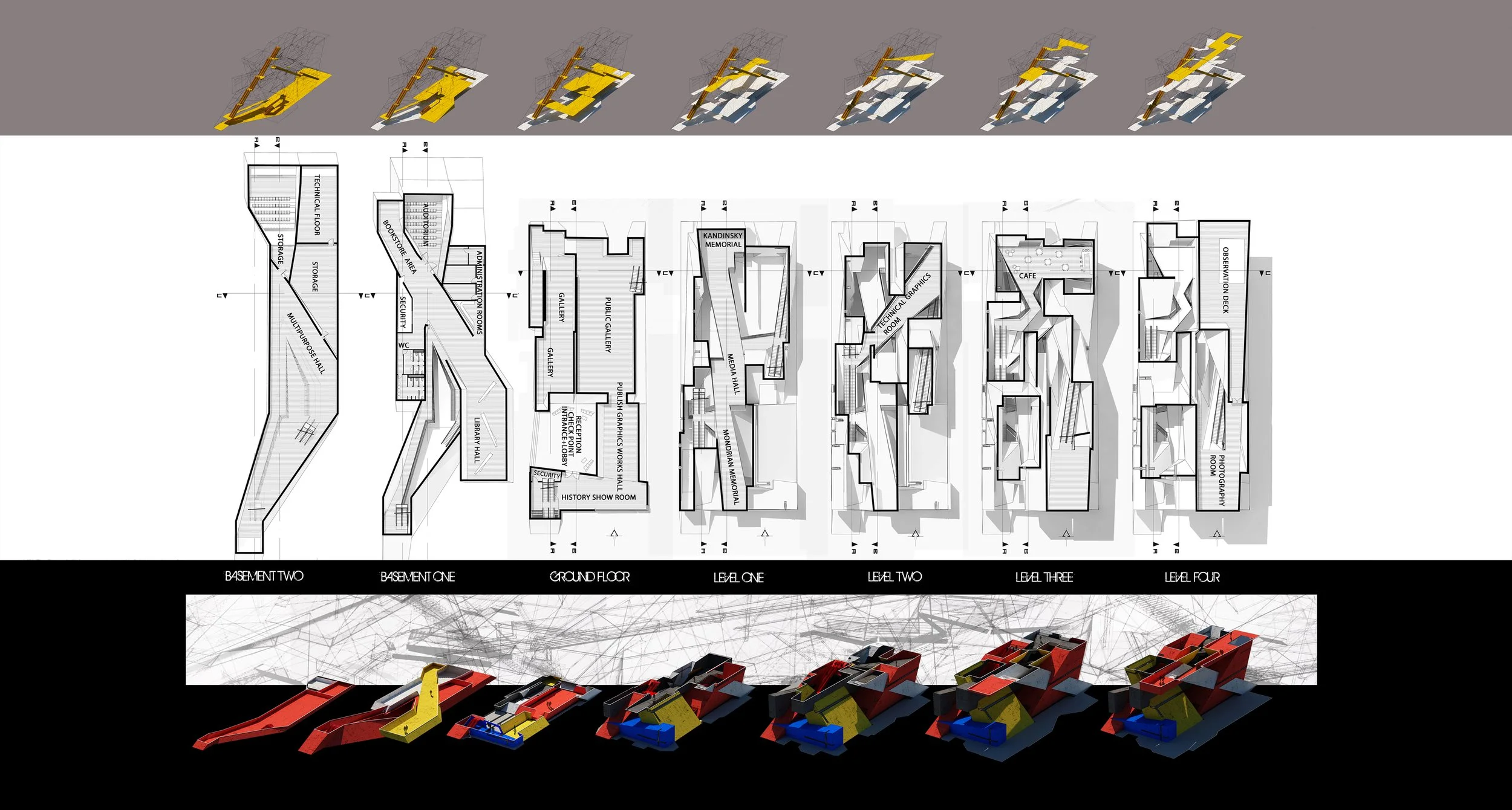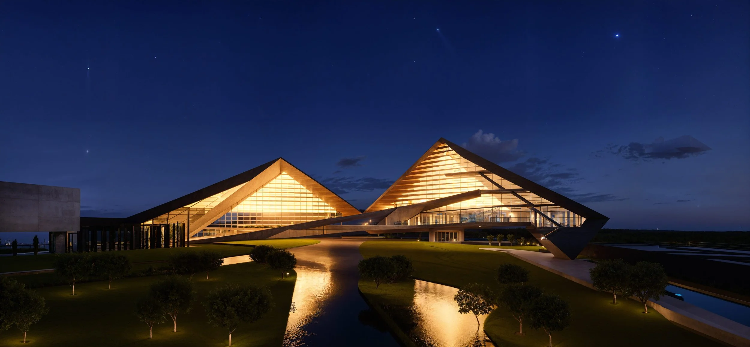 Silicon Valley landmark designed as a physical bridge between two sites, featuring two striking triangular masses. The structure consists of five main levels connected by an inclined tunnel and a linear path of stairways, ramps, and escalators. This self-exploratory journey leads visitors through multi-level spaces toward a central rooftop destination that symbolizes the project's forward-thinking vision. Its dynamic geometry creates a modern architectural silhouette while maximizing functional connectivity across the entire footprint. Ultimately, the project serves as a metaphorical joint, blending innovative design with a highly focused pedestrian experience.